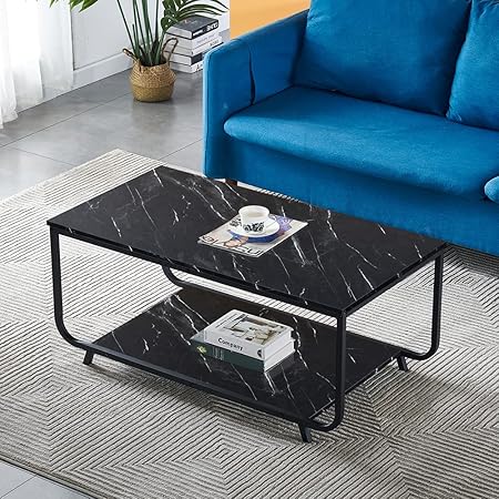 Sanery 2 Tier Black Marble Board Coffee Table With Black Metal Legs Accent Rectangular Coffee Table With Lower Storage Shelf For Living Room Black Marble Amazon Co Uk Home Kitchen
